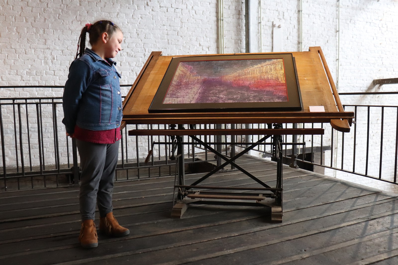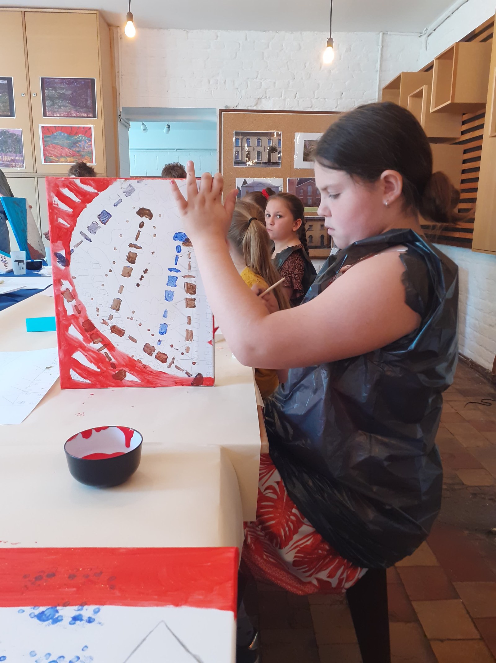 Installés dans le petit atelier pédagogique, les enfants sont étonnamment calmes et patients. L’environnement de bois upcyclé et de cocon à leur taille y serait-il pour quelque chose ? Françoise, l’animatrice, explique étape par étape la façon dont on va procéder. C’est très lent et posé et cela semble leur convenir. D’abord, dessiner l’esquisse sur papier – il faut au moins un terril, peut-être des maisons et un site industriel. Ensuite, la reproduire sur sa toile, que l’on a choisie carrée ou rectangulaire, sans trop appuyer sur la mine de crayon. Pas si simple que cela et certains y réussissent mieux que d’autres. Place à la peinture proprement dite. Pour le fond, il s’agit d’ »imiter » les circuits imprimés qui sont la marque de fabrique de Daniel Pelletti : on plie en deux des papiers, on coupe au milieu et on déplie, comme quand on faisait des petits napperons de dentelle. On utilise la perforatrice pour parsemer son pochoir de trous. Ensuite, on emballe tout le monde dans des sacs poubelle pour préserver les vêtements des taches d’acrylique. Le pochoir bien placé sur la toile – droit, de travers, en bas, en haut : comme on le souhaite -, on applique la peinture avec des cotons tige, certains la sèchent en tamponnant avec une éponge.