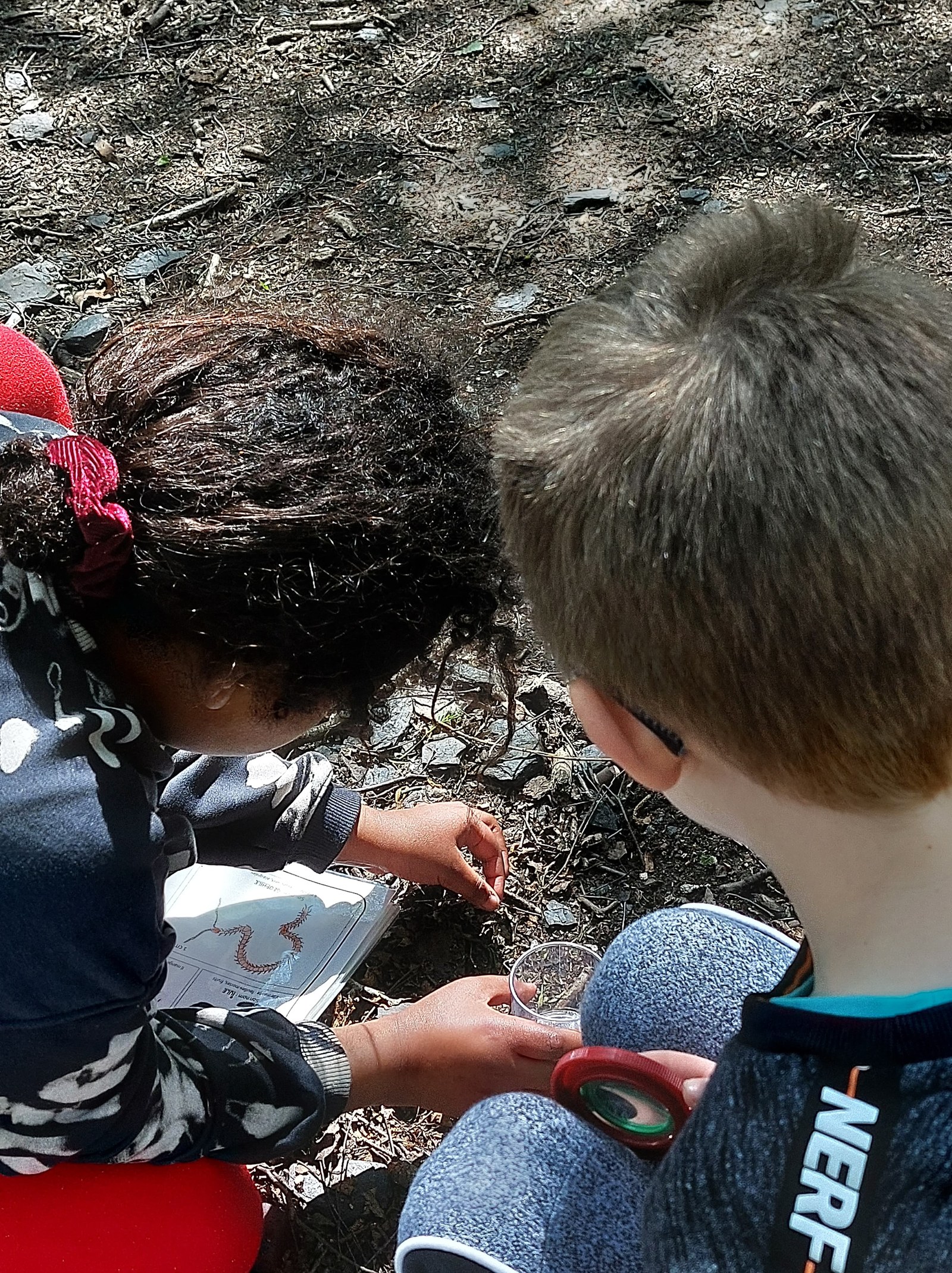 Le printemps est vraiment là ! La végétation est dense. « Avant, y avait pas d’arbre », dit Philippe. « Pas d’arbres ? Vraiment ? Précise un peu ce que tu veux dire… « Il n’y avait pas de feuilles sur les arbres, ils étaient tout nus ! ». On approche le terril par un autre côté que les deux premières fois, histoire de bien observer les changements de loin. Puis on se rapproche, et là, c’est toute une symphonie d’oiseaux qui nous accueillent : on s’en souvient, la première fois, en hiver, on avait à peine entendu deux oiseaux… Quelle joie d’être dans la nature, de pouvoir marcher ou courir à son rythme (enfin presque) ! On prend le chemin à la file indienne, on observe les schistes, le cerisier en fleurs -ce qui nous permet de nous rappeler la façon dont les graines se dispersent. Les oiseaux adorent les cerises !! Maëlyne passe la première et sursaute quand une tourterelle s’échappe d’un buisson à son arrivée : laquelle des deux a fait le plus peur à l’autre ? On se rend compte qu’on passe par le versant sud du terril : grâce au soleil et à la végétation. Puis on emprunte un chemin escarpé jusqu’au petit coin aménagé par l’école du dehors : aujourd’hui, c’est à nous de faire l’école dehors ! On s’assied en cercle sur les rondins de bois. Première mission : observer les petites bêtes au sol après les avoir attrapées délicatement et à l’aide de la clé de détermination. On soulève de vieilles souches ou des pierres : quel grouillement !! Beaucoup de cloportes, quelques chenilles qui avancent en se tortillant. Pas facile de compter le nombre de pattes tellement les animaux bougent ! Ensuite, on étale un grand papier blanc au sol et on secoue la branche juste au-dessus : quelques petites bêtes qu’abritait l’arbre y tombent… Philippe a peur des petites bêtes et participe peu à l’activité, même si Maelys essaie de l’entraîner.