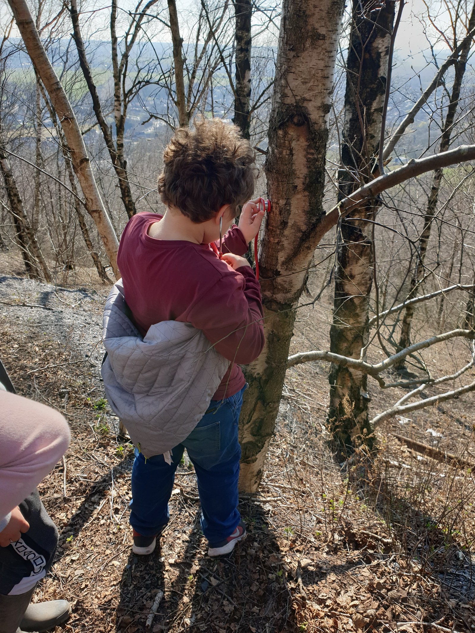 Surprise : on va jouer au docteur ! On va ausculter le tronc d’un bouleau avec un stéthoscope pour essayer d’entendre la sève couler. Mais ce n’est pas évident… Il y en a même un qui entend un aigle ; et le voilà parti au pays des Indiens.