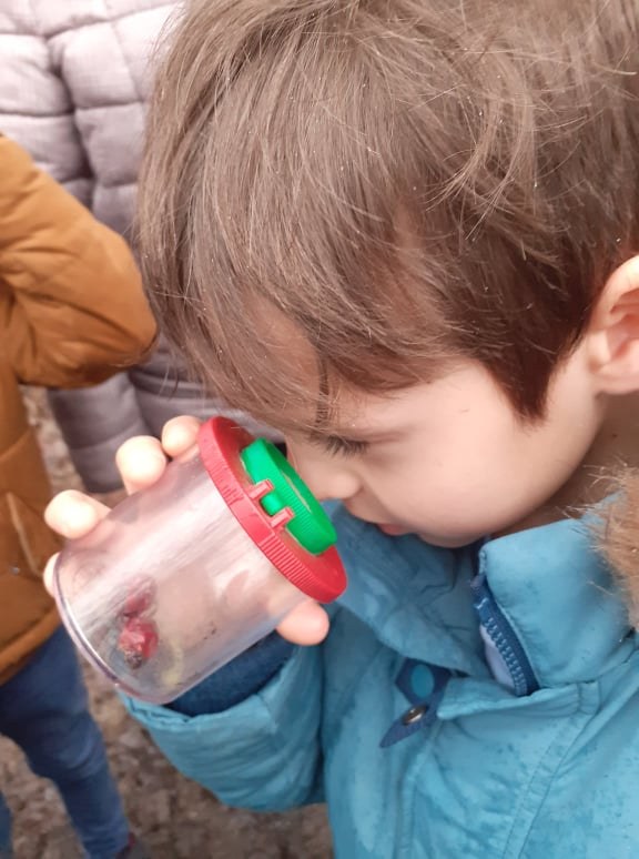 En haut du terril, on a parlé de la nature en hiver. La nature est au repos. Il n’y a presque pas de feuilles. On s’est tu, on a fermé les yeux et ouvert grand les oreilles, et on a entendu peu de sons dans la nature : 4. On les a imités : le bruit des voitures, le vent, un chant d’oiseau et un autre, Une mésange et une corneille. Il y avait des moustiques qui tournaient autour de nous, bizarre en plein hiver.