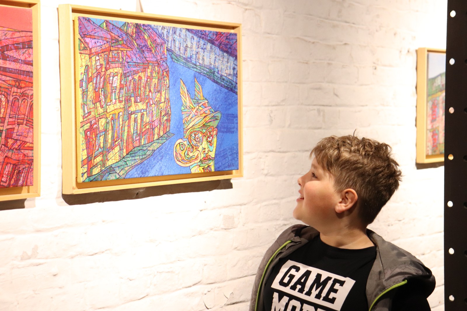 Le grand jour est arrivé : les enfants découvrent l’exposition de Daniel Pelletti. Un premier contact pour la plupart avec l’art ; la spontanéité est de mise en abordant les œuvres. Avant d’entrer quelques consignes s’imposent : sur le terril, on courait et on touchait tout ce qu’on voulait ; dans une exposition, on est calme, on se tient à distance des œuvres pour ne pas les abîmer. Deux univers complètement différents. Les enfants sont fiers : ils ont la chance de découvrir l’exposition en primeur, avant les journalistes et les autres visiteurs ! Ils ont également la chance de découvrir les coulisses du montage d’une exposition : les préparatifs ne sont pas encore tout à fait terminés.